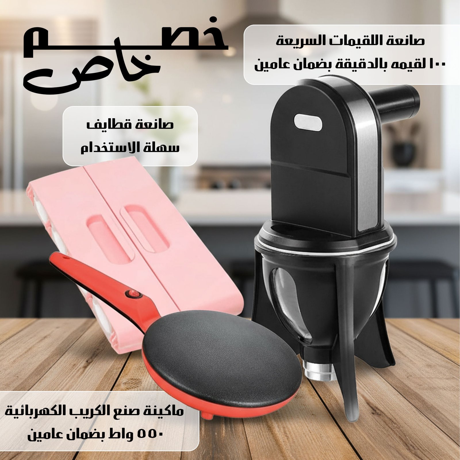 عرض صانعة اللقيمات + صانعة القطايف + ماكينة صنع الكريب وعيش التورتيلا بضمان عامين