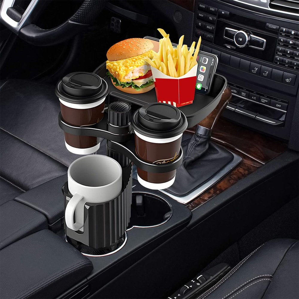 فيه حاملين أكواب وصينية أكل وحامل جوال عملي.